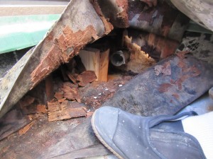 漏水による木材の腐食は激しくベランダ立上り部壁下地材、床下地材は漏水により朽ち果て、